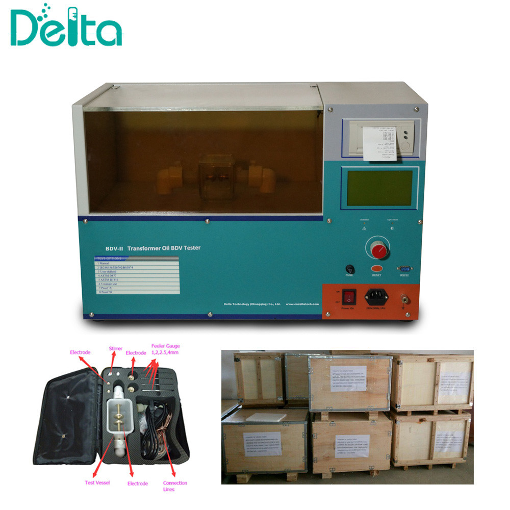 - مجموعة اختبار زيت المحول BDV-II ASTM D877 IEC156يحتوي على شاشة LCD كبيرة، وطباعة صغيرة ويمكنها تخزين 100 مجموعة من البيانات.
